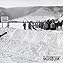 In this pre-1940 photograph, people stand in line for a sleigh ride at the Bayview Ski Trail entrance. The sign to the left reads: “Welcome to Bayview Ski Trails, No Entrance Fee, 1000 Foot Tow, Owner and Operated By Doherty Brothers [Collingwood Museum Collection, 988.7.4]